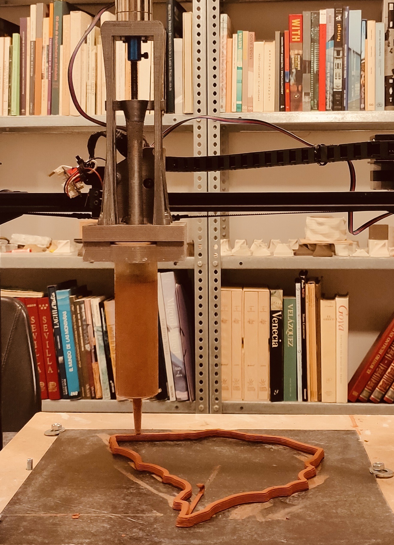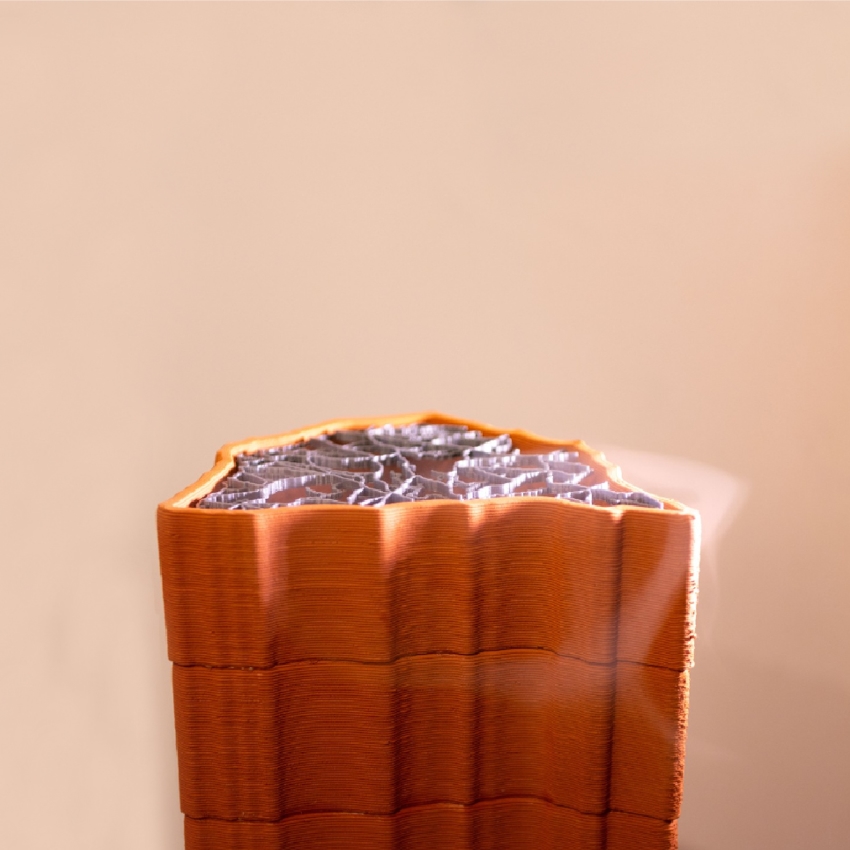 Esta pieza única ha sido ideada por Nomad Garden y Adriano Jiménez, quien ha desarrollado la impresión vinculando artesanía y robótica mediante impresión cerámica en 3D. Una tecnología que ha requerido de la invención y fabricación de la propia herramienta de impresión por parte de Adriano