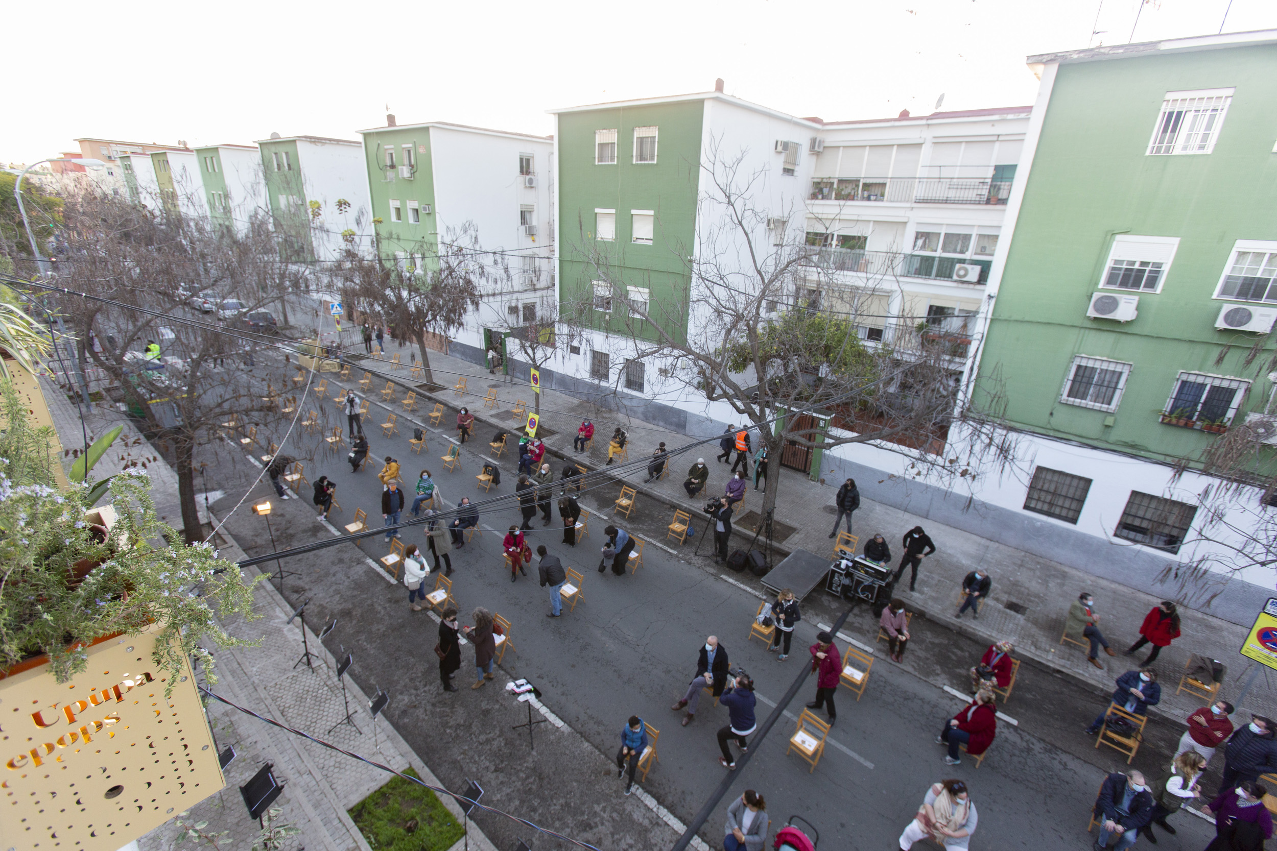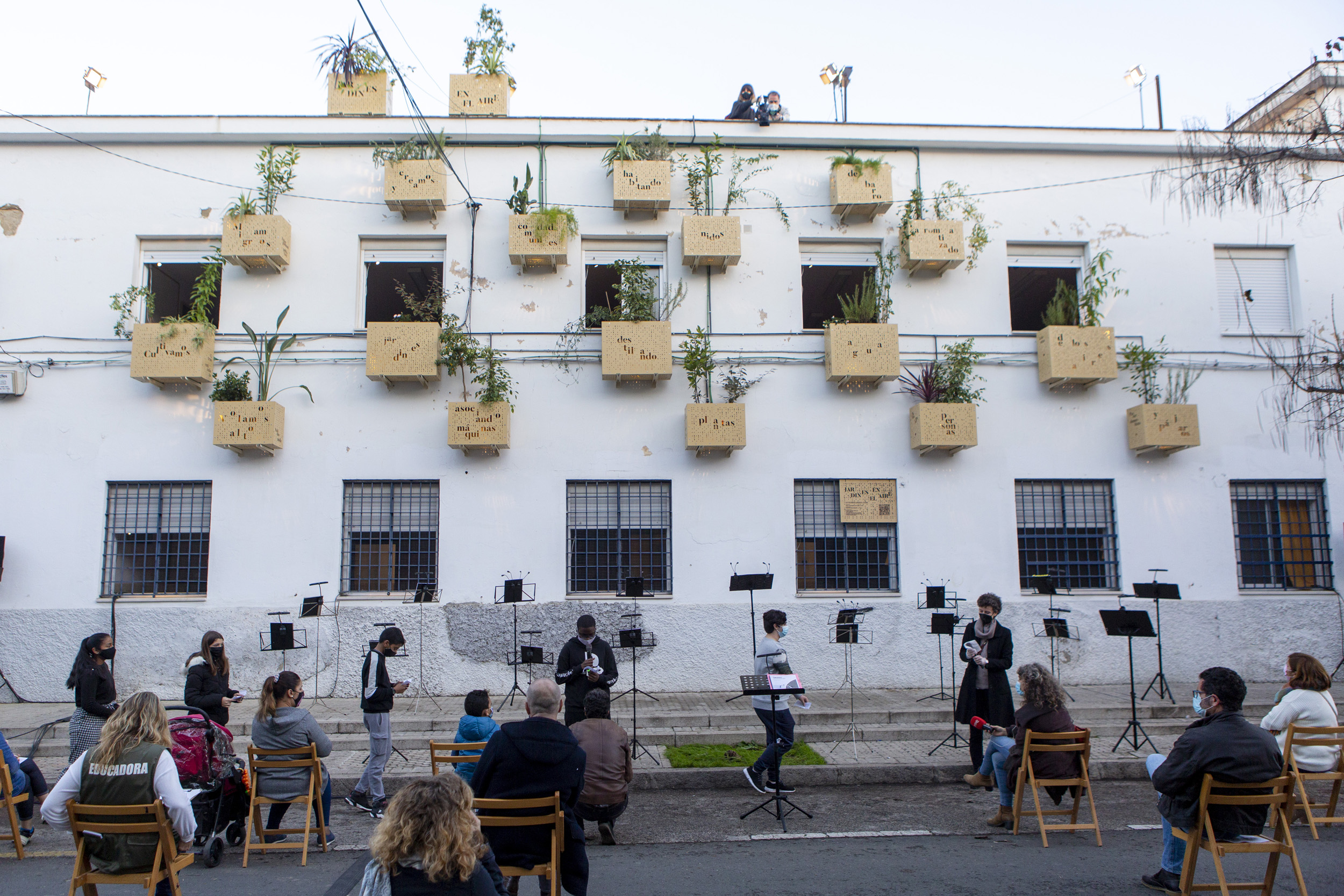 Un centenar de sillas perfectamente alineadas y con su correspondiente distancia de seguridad nos esperaban en la calle Candelilla para darnos la bienvenida en la tarde de domingo que no iba a ser una tarde como cualquier otra. El trajín en la Asociación La Candelaria era constante: gente que entraba y salía ultimando los detalles del gran estreno de ‘Sinergias’, la polifonía destilada a partir de la multiplicidad de voces -humanas y no humanas- que conforman el barrio de Tres Barrios-Amate y que se han ido recolectando en los talleres realizados desde julio de 2020. Iluminamos y presentamos también el primer jardín vertical, idea germen de todo este proyecto.