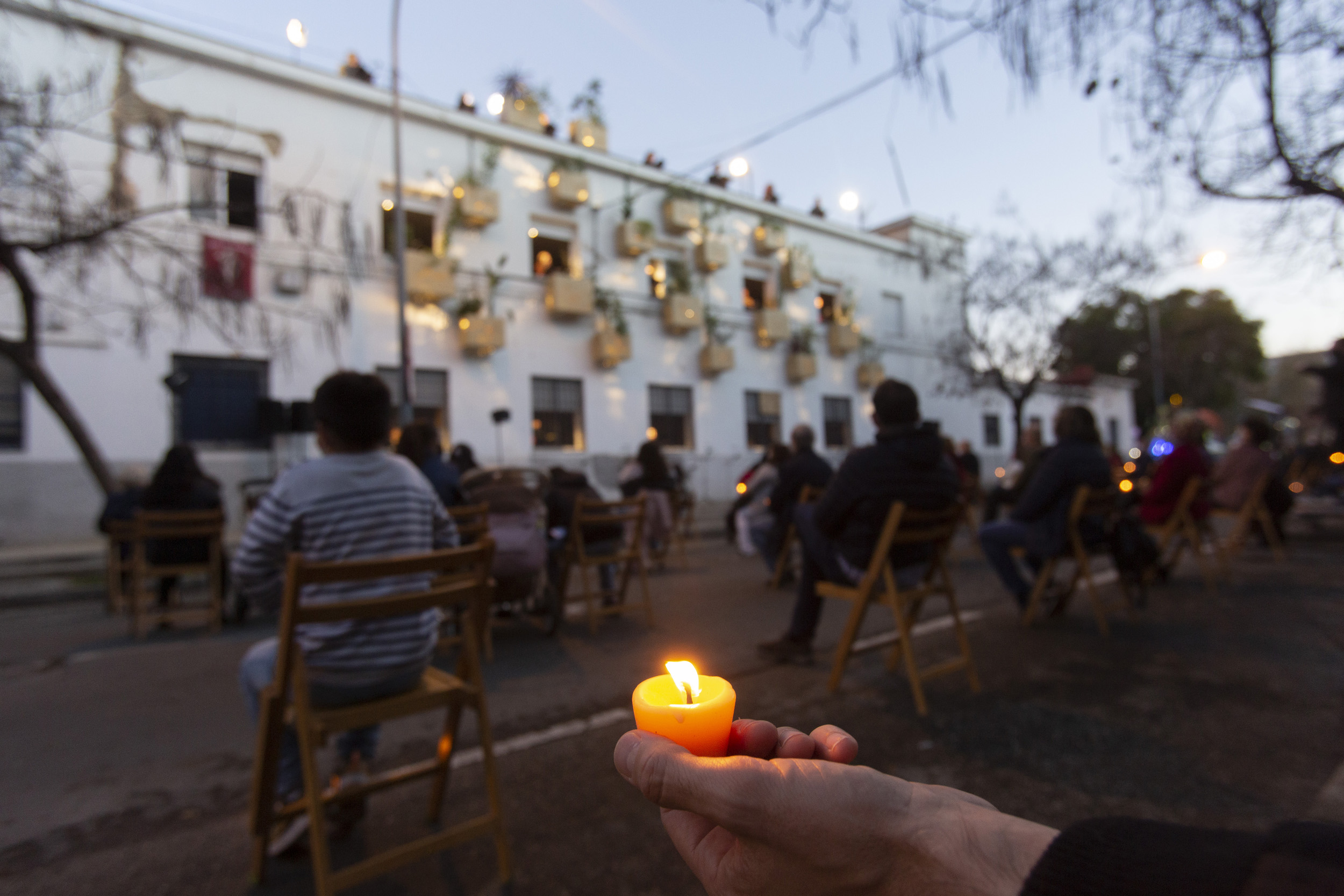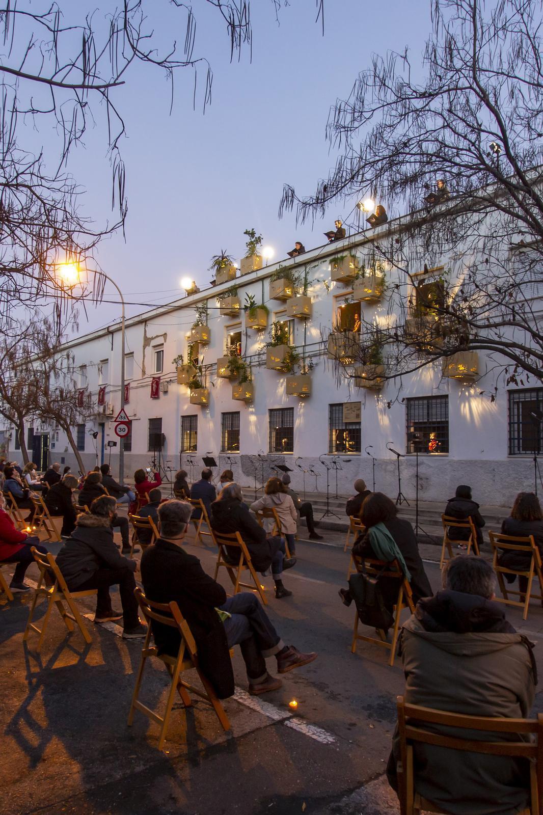 La noche va cayendo a la par que el público prende sus velas aromatizadas. Se iluminan las mashrabiyas. El coro se retira al calor del hogar, como nos solemos retirar cuando anochece. Aparece en las ventanas, iluminadas, y en la azotea de la asociación. Comienza el segundo acto, más pausado, como las noches en el barrio. Suenan pájaros. Sonidos de especies no humanas que conviven con nosotros. Murmullo de ramas, nana del ocaso que invita a dormir y luciérnagas del barrio, pequeños destellos que, desde las calles, señalan que la vida continúan en las casas.