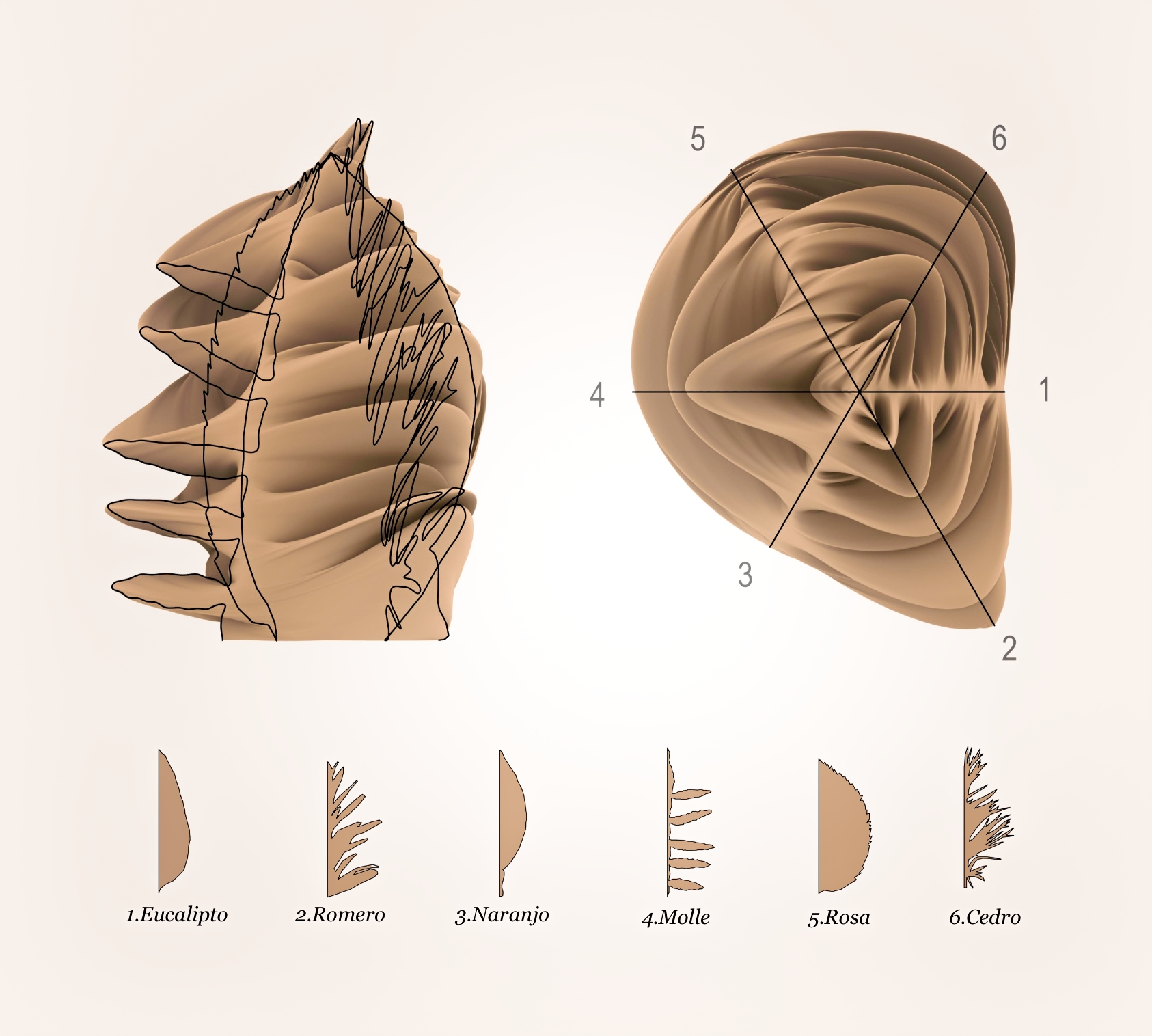 With these specific silhouettes collected and drawn by the kids, Adriano Jiménez worked for months to create a unique piece that would also serve as a cap for the new edition of the perfume. A work that arises from the geometric combination of the leaves used in the elaboration of the scent. Thus, by turning the cap on itself, we can recognise the silhouette of the leaves of rosemary, molle, eucalyptus, cedar or rose without any solution of continuity.