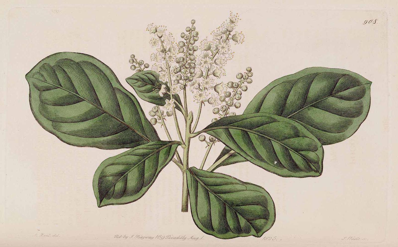 CombretaceaePresente fundamentalmente en el Caribe (Antillas), se puede encontrar también en las costas de Centroamérica (incluido México), península de Florida y norte de Sudamérica, habitual en zonas pantanosas y bosques inundados (pertenecen a la misma familia que algunos genéros de mangles).