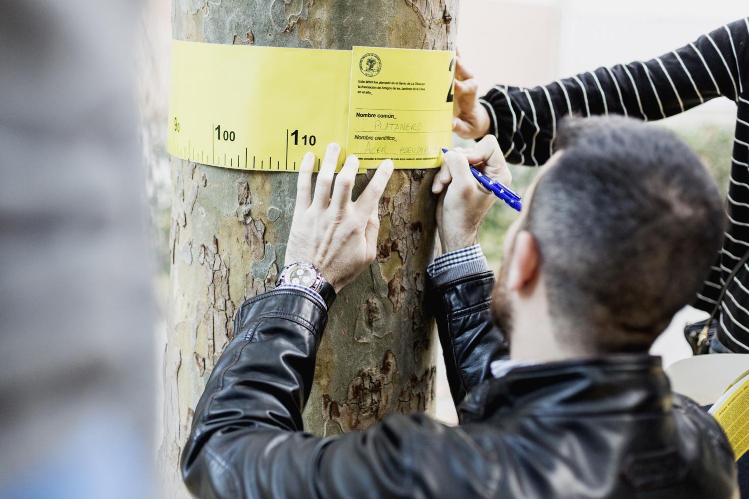 Jacinto Martínez, presidente de la asociación, ejerció de guía y de memoria viva en una ruta que contó con la colaboración de los respectivos nodos en Sevilla de los colectivos Jane’s Walk y Geoinquietos. Más allá del enriquecedor paseo, esta actividad denominada Atlas botánico animaba a los participantes a colaborar realizando un mapeo (digital o analógico) de algunas de las especies apreciadas y un anillado simbólico de esos árboles mediante etiquetas que medían el perímetro de su tronco, para su identificación por cualquier otra persona. Siguiendo la filosofía de las rutas de Jane’s Walk, se trataba así de convertir a cada vecino en un experto –botánico, en este caso– en su propio barrio.