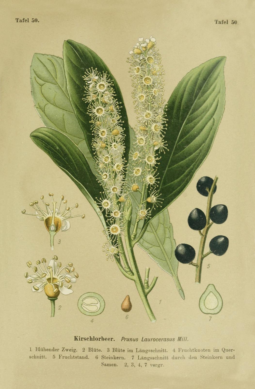Pertenece al género Prunus, nombre genérico originario del ciruelo en griego clásico προύνη, y que en latín evolucionó a prūnus; y que recoge unas 100 especies, muchas de ellas frutales y/o ornamentales: ciruelo, cerezo, melocotonero, almendro... En esta especie, el epíteto específico alude a su parecido "híbrido" entre el laurel y el cerezo, por sus hojas aromáticas (como el laurel) y su fruto, una drupa negra similar a una cereza, aunque crece en racimos. No tiene uso alimentario (hojas y semillas son tóxicas, aunque el fruto no), aunque sí se ha utilizado tradicionalmente en diversos usos medicinales.