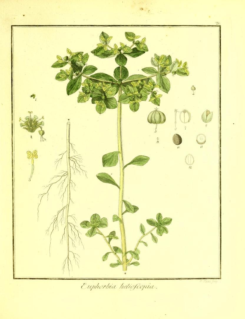 Planta herbácea anual nativa de Europa, donde crece de manera silvestre en las praderas y a la vera de los caminos. Su savia contiene un látex rico en ésteres sumamente tóxicos, y es venenosa tanto fresca como seca, en especial en contacto con el torrente sanguíneo. Su extracto se emplea en la industria farmacéutica.